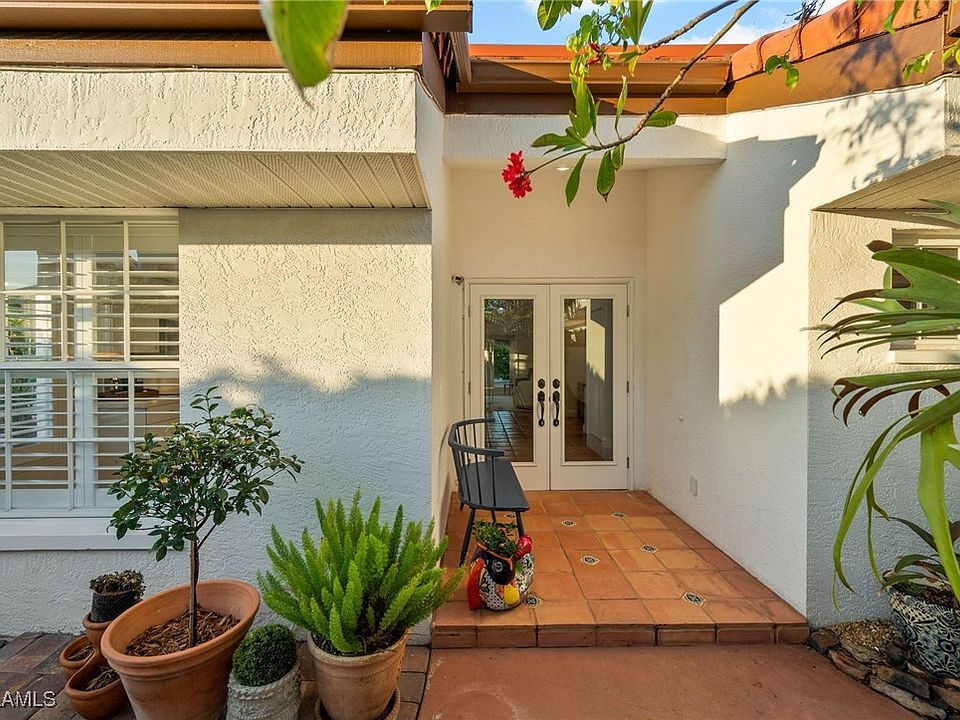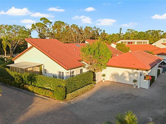 You will LOVE coming home to this very private Spanish style villa retreat situated on a private corner featuring amazing outdoor living spaces that include a beautiful courtyard with lighted greenery, bouganvillea & orchids, a screened room and a huge, pavered open patio w/a privacy wall covered in greenery to relax and enjoy the sunshine! This immaculately kept 2B+Den plus "turnkey" furnished home is full of light with soaring ceilings, 4 sets of impact glass french doors, beautiful mexican tile flooring thru out, updated kitchen and baths feature beautiful custom tile work. Wonderful open plan with a spacious great room opening onto outdoor spaces, a huge primary retreat with french doors to the expansive patio area, large walk in closet, luxurious bath w soaring ceiling & walk in shower, guest bedroom w/ensuite guest bath, the den area off of guest rm has a great view of the lushly landscaped courtyard - perfect for meditation/yoga room or guest relaxation. Additional ante room off of garage can be used as a small office. Spacious and crisp white kitchen features a newer refrigerator, bright and sunny breakfast area and a built in desk & pantry. Updates thru out including a newer HVAC motor & thermostat, new electrical panel, newer washer/dryer and hot wtr htr, updated landscaping, garage door & more! Fantastic central location - short walk to Bell Tower Shops featuring the new Nordstrom Rack, Capital Grille, Cantina Laredo, Regal Cinemas and all of Bell Tower's fabulous shops & restaurants! Close to US41, Target, Costco, Beall's and a short drive to area beaches, medical and SWFL Int'l airport! Not in the flood zone and low, county only property taxes and Low HOA of just $175/mo!! Hurry - this move in ready home is a true gem!