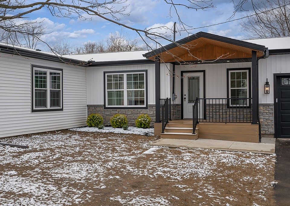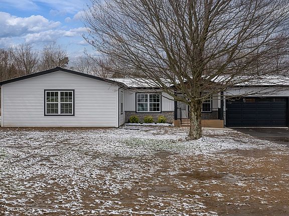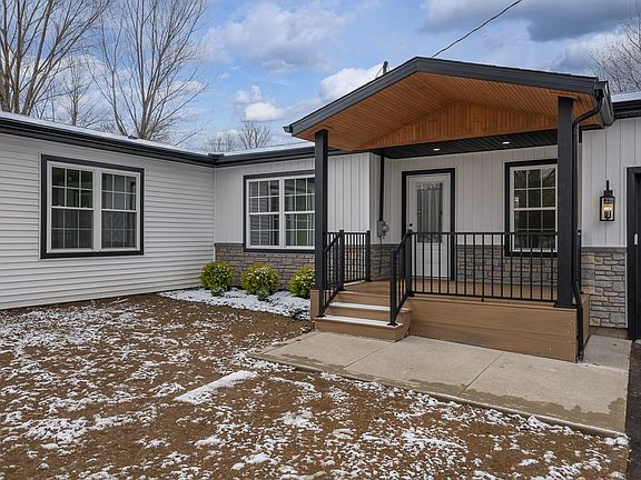 Welcome to your newly renovated dream home, featuring three spacious bedrooms and two full bathrooms. Step inside to discover an open-concept living area, highlighted by a stunning kitchen with a quartz waterfall island at its heart. The entire home is adorned with luxury vinyl plank flooring, adding elegance and durability. The expansive master bedroom offers comfort and style. Bathrooms are beautifully finished with tiled flooring, and the convenience of first-floor laundry adds to the home's appeal. Outside, enjoy the tranquility of a 1.44-acre lot from the comfort of your charming front porch or the inviting deck at the back. A brand-new driveway leads to the attached garage, providing ample space and convenience. While enjoying the peacefulness of country living, you'll appreciate the home's close proximity to local amenities. This ranch-style house combines the best of both worlds, offering serene living with easy access to everything you need