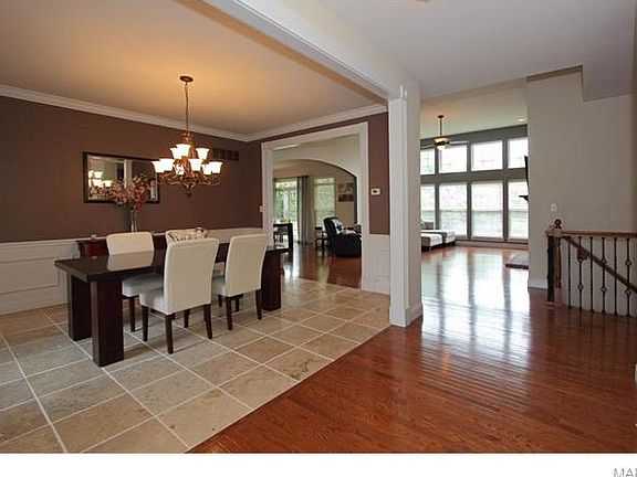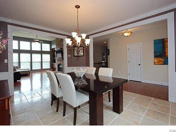 You must see this stunning 3BD/2.5BA ranch! Gleaming hardwood floors lead into living room that features 12' ceiling, built-in book shelves with granite countertops, wall of windows, surround sound & floor-to-ceiling brick-&-stone fireplace. The dining room has new Travertine tile, picture-frame molding, chair rail & crown molding. The kitchen is gorgeous and features a new Travertine back splash, hardwood floors, granite countertops, stainless steel appliances & 42" cabinets with pull-out drawers. The master suite has tray ceiling, walk-in closet, double vanity, bathtub with Travertine tile surround & a separate shower. Upgrades include 9' ceiling throughout, main-floor laundry, double vanity in hall bath, chair rail in bedrooms, French doors in office, 5-1/4" baseboard, 2" blinds, 6-panel doors, iron baluster, covered patio with ceiling fan, in-ground sprinkler system & 3-car garage. Within minutes of Chesterfield Valley Premium Outlet shopping centers.