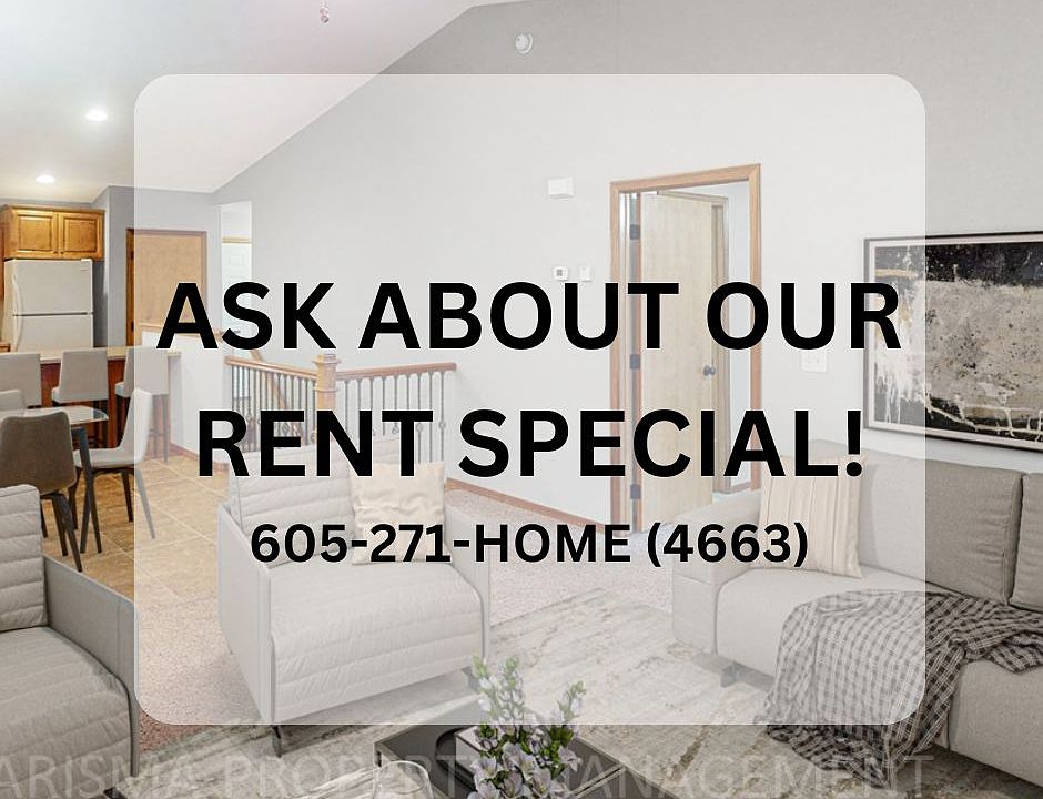 FIRST MONTH is $99! To schedule a showing, please call our office at (605) 271-HOME (4663) or go to our website.. Amenities: *3 Spacious Bedrooms, 2.5 Bathrooms *1973 Square Feet of Living Space *Master Bedroom with Walk In Closet and Master Bath *Open Concept Kitchen With Island *Lots of Cabinet and Countertop Space *Black Appliances *Refrigerator *Stove *Microwave *Dishwasher *Dining Area *Half Bath With In Unit Laundry Hookups *Finished Upper and Lower Level Living *Lower Level With 2 Bedrooms and a Bath *Lower Level Multi-Purpose Rooms *Lots of Storage *Double Attached Garage Prices, Specials, and Availability Are Subject to Change Without Notice! To schedule a showing, please call our office at (605) 271-HOME (4663) or go to our website.. This townhome is professionally managed by Charisma Property Management, Inc. Resident pays all utilities including snow. Lawn care included.