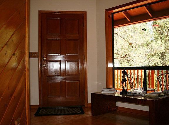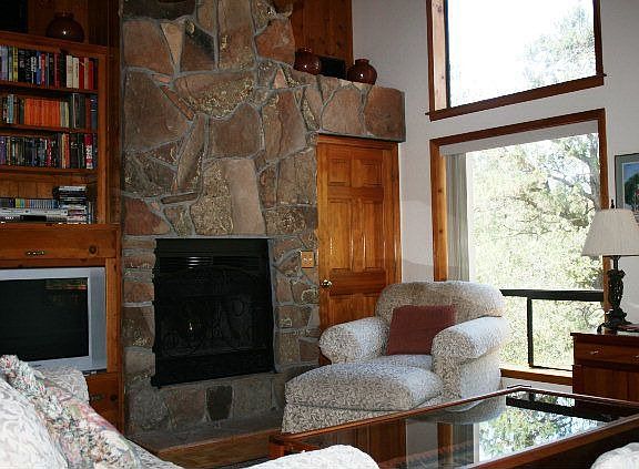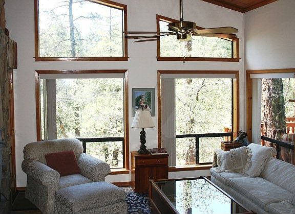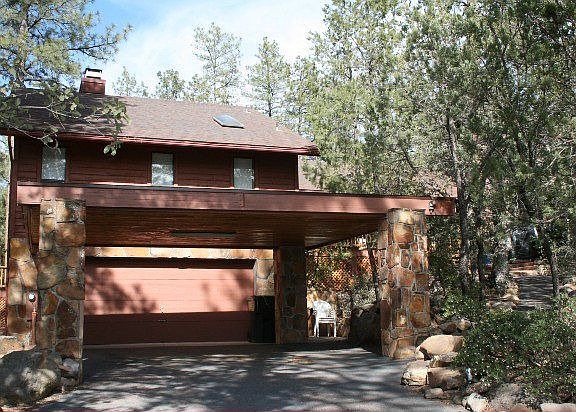Comfortable & peaceful with glimpses of the surrounding mountains & the Mogollon Rim on 1 acre amongst the tall Ponderosa pines. This unique split level home features an open living area with woodburning fireplace, wet bar, parquet wood floors, vaulted knotty pine ceilings & lots of windows. The kitchen is well appointed with regular & convection ovens, breakfast island & picture windows that look out to the densely forested backyard. Large arcadia doors open off the dining area to a p rivate deck that beckons you to sit & relax & watch the visiting wildlife. The spacious master bedroom suite features a romantic woodburning fireplace, large picture window that frames the outdoor scenery & a luxurious bathroom to match. There are two generous sized bedrooms, a full bath plus a separate sitting area ideal for reading or listening to music. Nicely landscaped with raised flower beds & a meandering pathway to the welcoming front redwood deck & entry from the 2-car garage & carport. Must see!