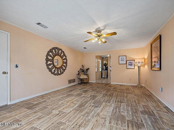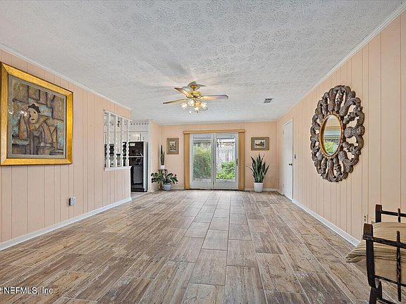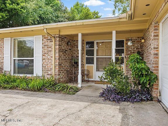 This adorable brick home is located in an established neighborhood tucked away from congestion but with easy access to shopping, dining, entertainment and NAS Jax. Inside you'll find new carpeting, easy care laminate plank flooring and attractive tile floors. There are separate living and dining rooms, each with French doors leading to different patios. The living room opens to the side patio and the dining room leads to the covered back patio, a great design for entertaining and family fun. The light and bright kitchen boasts a handy prep island, plenty of cabinetry and an adjacent dine-in area. The primary bedroom is large enough to accommodate a variety of designs and the additional bedrooms are both well sized. Outside, a cozy backyard with lush foliage is a great spot to relax, especially on the covered patio that also has built-in skylights to enjoy the sunshine without sweltering. Grab this one before it's gone!
