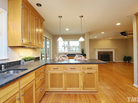 Roomy, 4-bedroom home on tranquil, wooded lot in the heart of the Triangle! Convenient to I-40, I-540, and RTP--near restaurants and shops. Hardwood floors on main level. Gas range, custom oak cabinetry, stunning granite countertops in kitchen. Cozy family room with pretty fireplace. Large upstairs owner's suite with lovely windows and bright, spacious bathroom. Huge screened-in porch for your warm-weather meals and awesome gatherings. Big, beautiful, fully-fenced back yard. Don't miss this charming home!