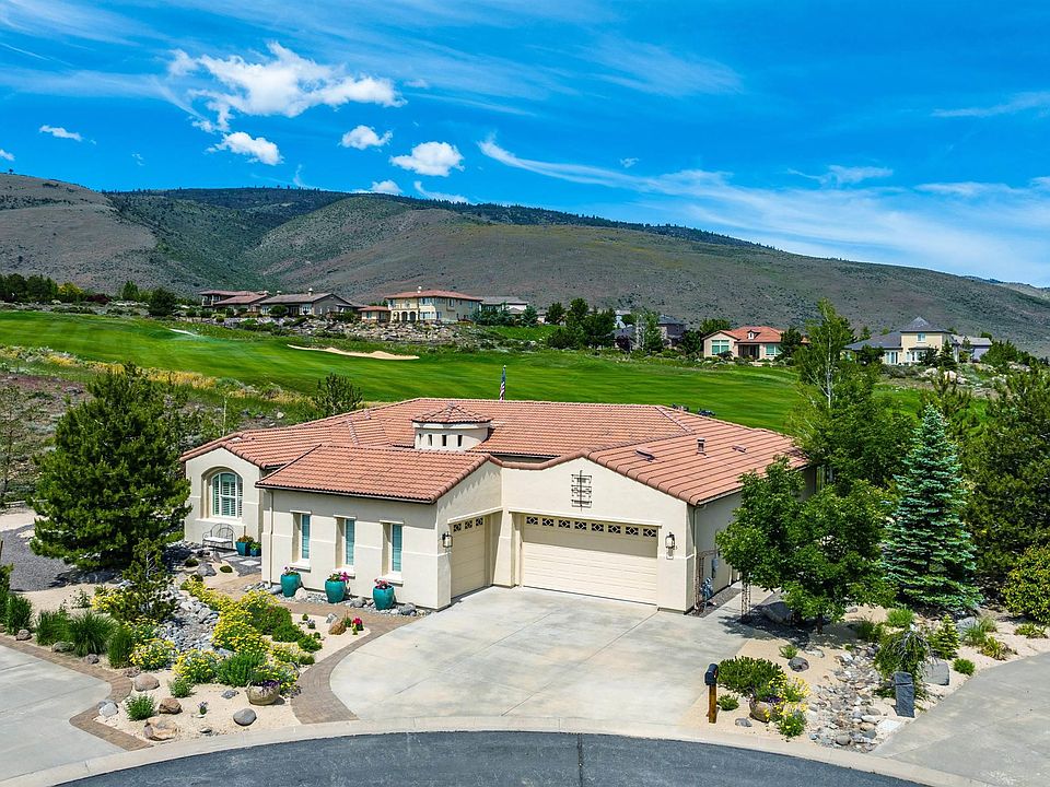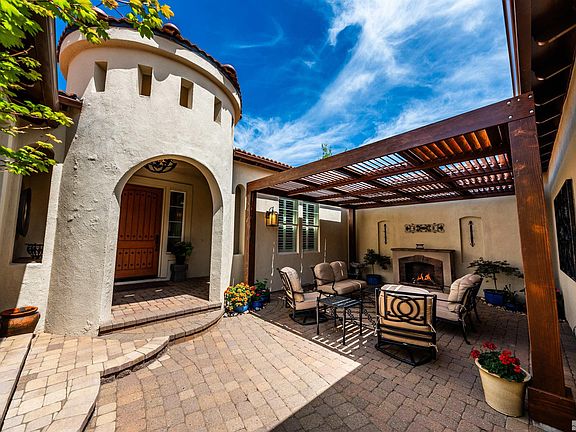 Views, Views, Views. This single level home is located in Arrowcreek overlooking the 2nd hole of Private Arrowcreek Golf. It boasts stunning views from the living areas, extensive paved patio, and the main bedroom. As you approach the property, you'll be welcomed by a private and shaded outdoor retreat complete with a fireplace. Upon entering the house through the main entry door, you'll immediately notice the view of the living room, with its captivating views of the golf course, and a spectacular, double-sided fireplace that adds to the ambiance. The open floor plan seamlessly connects the living, dining, and kitchen areas, all of which offer beautiful views of the paved patio area, golf course, and city skyline. The living room is adorned with hardwood floors and another gas fireplace, creating a cozy and inviting atmosphere. The main bedroom suite is thoughtfully positioned at the opposite end of the house, ensuring privacy and tranquility. The main bedroom features a spacious layout with a sitting area, allowing you to relax and unwind in comfort. There is a separate bedroom and living area that is ideal for guests or as a game room. Outside, the property boasts beautiful landscaping with a variety of seating areas strategically placed to take full advantage of the breathtaking views. You can enjoy the peacefulness of the water feature while taking in the scenery or use the spaces to entertain guests. In addition to the stunning property itself, the Arrowcreek community offers a range of amenities and conveniences. Security gates ensure a safe and private environment, and the clubhouse provides access to various amenities such as a swimming pool, gym, tennis courts, and more. If you're interested in exploring this remarkable property, it is highly recommended to schedule a showing today. Please note, the wood mantel above the fireplace will be replaced before close of escrow - mantel has sentimental value