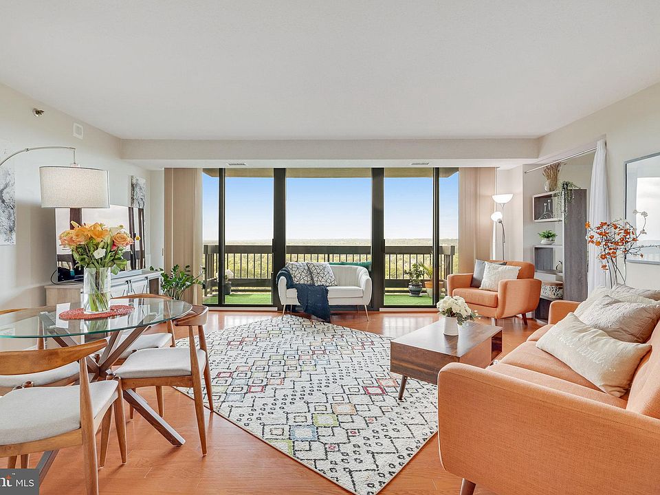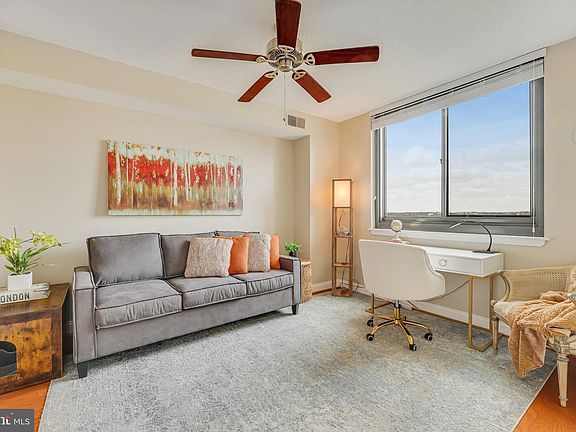 This LIMITED model offers a flexible floorplan with 2 bedrooms, 2 full bathrooms PLUS a den, with floor-to-ceiling AMAZING views overlooking greenery & beautiful sunsets every night! The den, located off the kitchen & living room, can be used as formal dining room, office, exercise room, or other. Spacious rooms & BAs offer plenty of living & also closet space, incl large walk-in closet in the primary BR, with hardwood floors throughout! Enjoy a prime garage parking space with direct access to a secure building & convenient in-unit laundry! There is also an extra storage unit. This is one of the most established condominium buildings in Northern Virginia, constructed with spacious, elegant & care-free living in mind. ABUNDANT AMENITIES include swimming pool, two rooftop party rooms, one with view of the Washington Monument, exercise rooms, dry & wet saunas, game rooms (billiards and ping pong), car wash, EV charging stations, library, extra storage areas, secure parking garage & more! Front desk concierge available 24 hours a day to assist with questions, parking, food deliveries, package deliveries, and use of amenities. FANTASTIC LOCATION within a block of Target & two large shopping centers for all your needs, just minutes to Shirlington, Ballston, Pentagon, Old Town, Del Ray, and DC! Commuting is easy via Route 7, Interstate 395, Route 50 or local roads, and Metrobus stop at entry that has routes to several metro stations! OPEN THIS FRI 9/20 @ 5:30-7:30, and SAT & SUN 9/21-22 @ 2-4