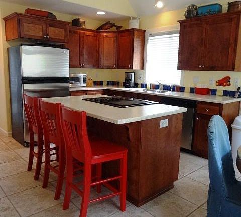 Popular vacation rental in Four Sisters Village. Ideal location at rear of subdivision, close to beach. Upgrades include Corian countertops, stainless steel appliances, tile floors, and river rock fireplace. Private patio wired for hot tub.