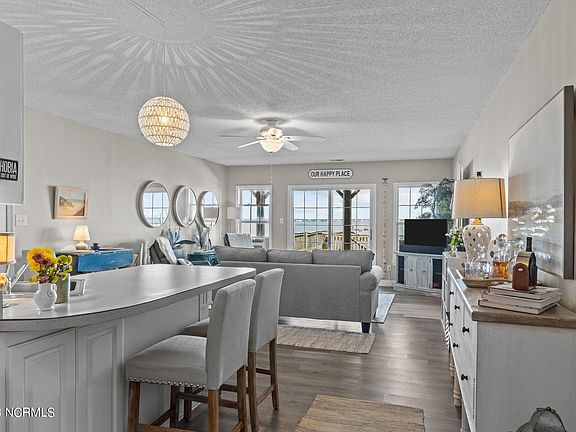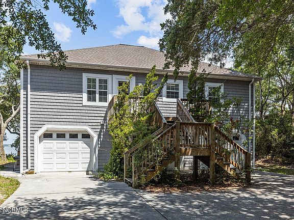 A SOUND FRONT TREASURE! Situated on a quiet wooded street, this lot opens up to gorgeous Bogue Sound vistas from bottom & top floors. Downstairs you will find a beautifully appointed 1 bedroom walkout, with a second sleeping & laundry area requisitioned from what was the garage. Upstairs is the main living space with updated sitting room furniture, vaulted ceilings, an open floor plan, and a covered deck to enjoy water views - rain or shine. The dock is over 150' long with a sitting area and boat lift at the end. Also, delight in the expansive outdoor living space on shore... Imagine the cook outs, parties, sunsets, and water activities you can enjoy at this wonderful sound side place, less than 10 lots away from the beach.
