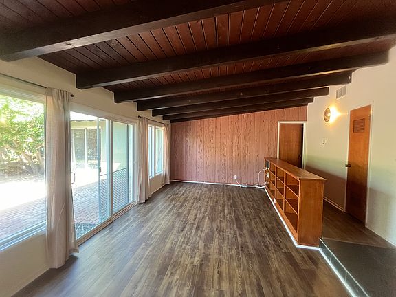 The inviting living room is filled with natural light from multiple sliding glass doors, which open to an expansive backyard offering plenty of trees for privacy. The large brick patio is perfect for entertaining or enjoying cool evenings outdoors. With vinyl and tile flooring throughout and original features thoughtfully restored, this home beautifully blends modern convenience with classic charm. Additional highlights include ample built-in storage, a spacious 2-car garage, and a serene location on a quiet street surrounded by mature trees. The backyard features over 10 fruit trees and a large area already plumbed for a future garden. Tenant is responsible for all utilities and landscaping. Don't miss this unique rental opportunity!