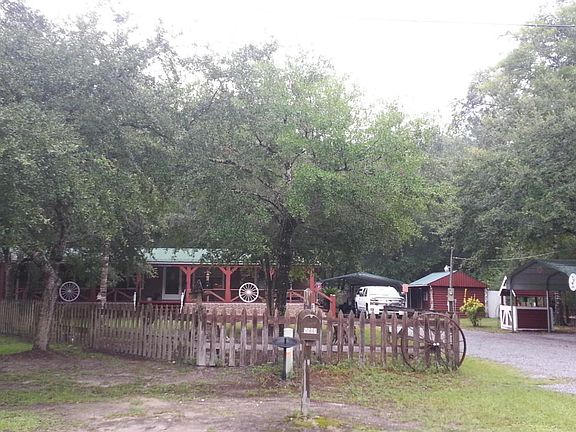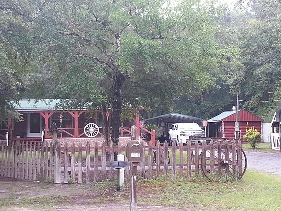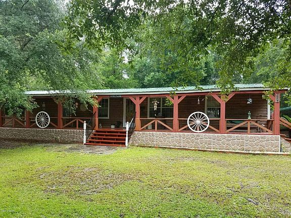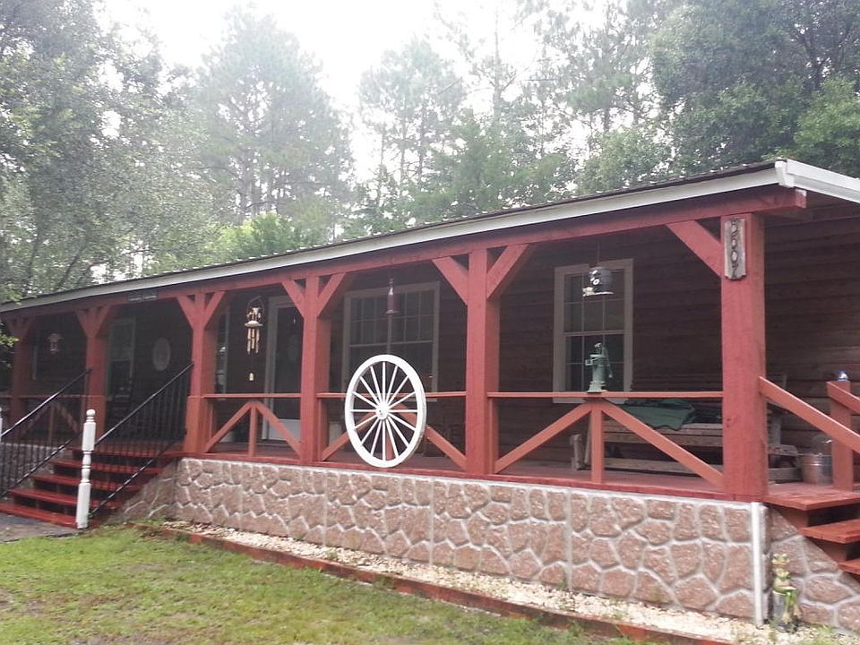 Perfect rustic charm abounds in this cute 3/2 doublewide with loads of add-ons. Huge screened in porch on one side (24x12), full length porch on the front(70x8), and covered 14x26 porch in the back. Metal roof, log cabin look for siding. You also have a large 14x26 family room with separate a/c., split bedroom plan, Several additioanl carports and backyard fenced with nice firepit for those cold days of winter. You have to see this house to appreciate all it has to offer. all sizes and dimensions are appx. 1 bedroom has been coverted to office.