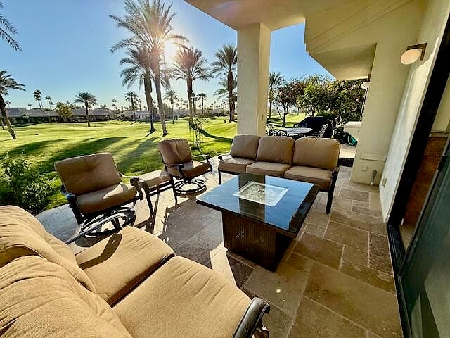 This rarely used Champion Plan four 90 series home is perfectly positioned between two pools and along the 11th fairway of the Arnold Palmer Private course at PGA West. Recently upgraded with fresh paint, remote control blinds, plantation shutters and LED lighting throughout. Featuring a separate laundry room, three bedrooms, three bathrooms in an inviting open floor plan. A serene private courtyard off the primary bedroom along with a spa tub shower combo, upgraded cabinets, counter tops and dual sinks make this a wonderful place to relax after a hard day at play. The kitchen and living room flow seamlessly together with expanded counter space and an opening between kitchen and living room. Enjoy the elegance of vaulted ceilings, mirrored wet bar with glass shelves, and a cozy fireplace with gas logs. Outside, a recently extended patio with Terrazzo stone surface.