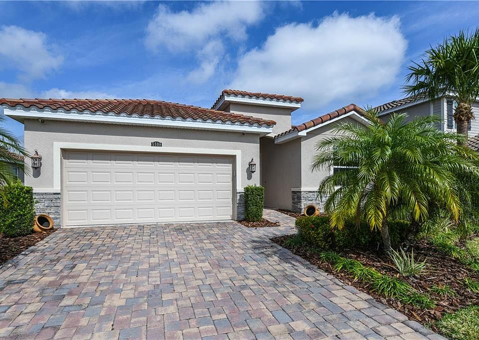 Welcome to the gated community of Ashton Pointe, an enclave of 49 maintenance-free homes. Minutes to I-75, A+ rated schools and Siesta Key. The low association dues include gated entry, lawn and landscape maintenance, irrigation, and community playground with no CDD fees. Quality construction built by DR Horton, this Lantana floorplan is 2062 sq. ft., 3-bedrooms, den, 2 ½ baths, 2 car garage. This is an FPL certified energy efficient home with 15 seer AC, radiant barrier roof sheathing, double pane thermal low E windows. Exterior features include barrel tile roof, hurricane shutters, brick paver driveway and entry, stone accents, and fenced property. Interior upgrades include crown molding, wainscot interior paneling, window casing, and upgraded light fixtures. Tile flooring throughout main living areas with laminate flooring in den and master bedroom. The kitchen, fronted by the large island/breakfast bar, granite countertops, tiled backsplash, stainless steel appliances, 42" staggered cabinets, and a corner pantry. The open concept floor has a spacious great room with decorator's touches, and it's wired for surround sound. The den can be used for formal dining, office or playroom. The Master Bedroom offers two spacious closets, one with custom shelving. Adjoined is the master bath featuring dual vanities, garden tub, tiled walk-in shower, and private water closet. Extra perks include a screened in patio with tiled floor and bar for entertaining and heavy-duty overhead garage storage.