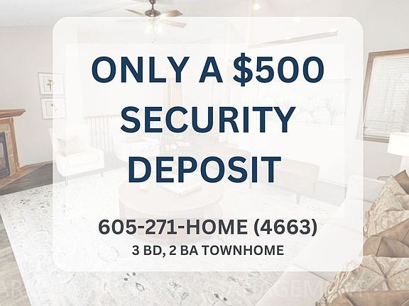 ONLY A $500 SECURITY DEPOSIT! NO APPLICATION FEES! GREAT AMENITIES! *Great Location! *Close to Shopping Mall, Dining, Schools & More! *Southwest Sioux Falls *Central Air Conditioning *Amenity Filled Kitchen *Lots of Cabinets and Countertop Space *Refrigerator *Stove *Dishwasher *Microwave Range *Garbage Disposal *Breakfast Bar *Dining Area Off Kitchen *Laundry Hookups *Fully Finished Upper and Lower Living Areas *Fireplace *Vaulted Ceilings *High End Finishes *Full Bathroom on Each Living Area *Large Master Bedroom On Upper Level With Walk In Closet *Large Lower Level Multi-Purpose Room *3 Spacious Bedrooms *Single Attached Garage *Pet Friendly With Restrictions Prices, specials and availability are subject to change without notice. Finishes, flooring, color, location at the property and layout may vary from unit to unit. Call today to see your new home! 605-271-HOME (4663) This residence is located in Southwest Sioux Falls near area shopping, dining, schools & more! This town home is built with quality construction, high-end finishes and was built with you in mind. This town home has all the must haves you are looking for. This Bakker Place town home feature vaulted ceilings, a fireplace, attached single stall garage, amenity filled kitchen with a breakfast bar and dining area, fully finished upper and lower living areas, 2 full bathrooms in each living area, a master bedroom with a large walk in closet, a lower level multi-purpose room, and so much more. One look and you will fall in love! With 1919 square feet of living space, you have all the room you need to study, work, sleep, entertain or simply relax. Resident pays all utilities. Lawn care provided by the owner. We are pet-friendly with some restrictions. Professionally managed by Charisma Property Management, Inc.