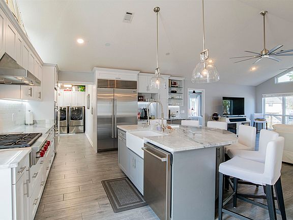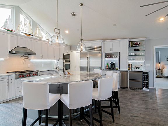 Florida living at its finest! No detail has been overlooked in the design, details or finishes of this exceptional waterfront home which includes a true mother-in-law suite that would be a great income producing rental or Air bnb. A coastal yet sophisticated color palette enhances the wide open main living area. There, you will find a great room that features cathedral ceilings, tile flooring and a wall of windows with panoramic views of the Bay. The kitchen is a chef's dream with an abundance of beautiful cabinetry, granite counters, an enormous center island and stainless appliances that includes a double oven and a Wolf gas range. A convenient entertainment area features a coffee bar, built in wine rack, separate ice maker and beverage fridge. The split bedroom floor plan offers plenty of privacy for the master suite which includes a large bedroom with carpeted flooring and tall windows that let in plenty of natural light. The master bath comes with tile flooring, double vanities, a spacious walk-in shower, walk-in closet and private water closet. The 2 additional bedrooms have carpeted flooring, ceiling fans, large windows and ample closet space. Another full bath completes the upper level and comes with tile flooring, single vanity and a tub/shower combo with a beautiful tile surround. Downstairs is where you will find the mother-in-law suite with its own separate entrance. This space consists of a large living area, kitchen with a full size refrigerator and microwave, a large bedroom and a bath with a single vanity and walk-in shower. What would the Florida lifestyle be without a spectacular outdoor space? This home provides just that with an enormous second story deck where you can grill out in the well appointed outdoor kitchen while you enjoy dramatic sunrises and peaceful sunsets . When you are ready to get out on the water, you only need to drop the boat in from your private boat lift in your backyard. Start living the Florida lifestyle today!