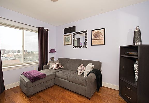 Come home to an open design corner unit condo with tremendous natural light, Southern exposure across the dining room and living room with beautiful downtown NYC views. The condo sits above all neighboring buildings for a grand open air feel. From this height looking west you capture lovely sunsets over the Meadowlands arena. Enjoy the comforts of an elegant steel and concrete building with elevator service that was constructed just six years ago. Well-appointed kitchen features granite countertops, stainless steel appliances, and wood cabinetry with soft close drawers. Features include in unit washer/dryer, central air conditioning, and hardwood floors. Located just minutes from the light rail and NYC buses. Enjoy the convenience of onsite garage parking.