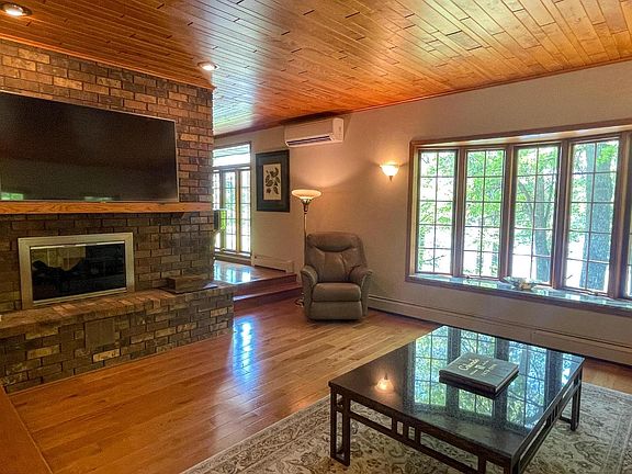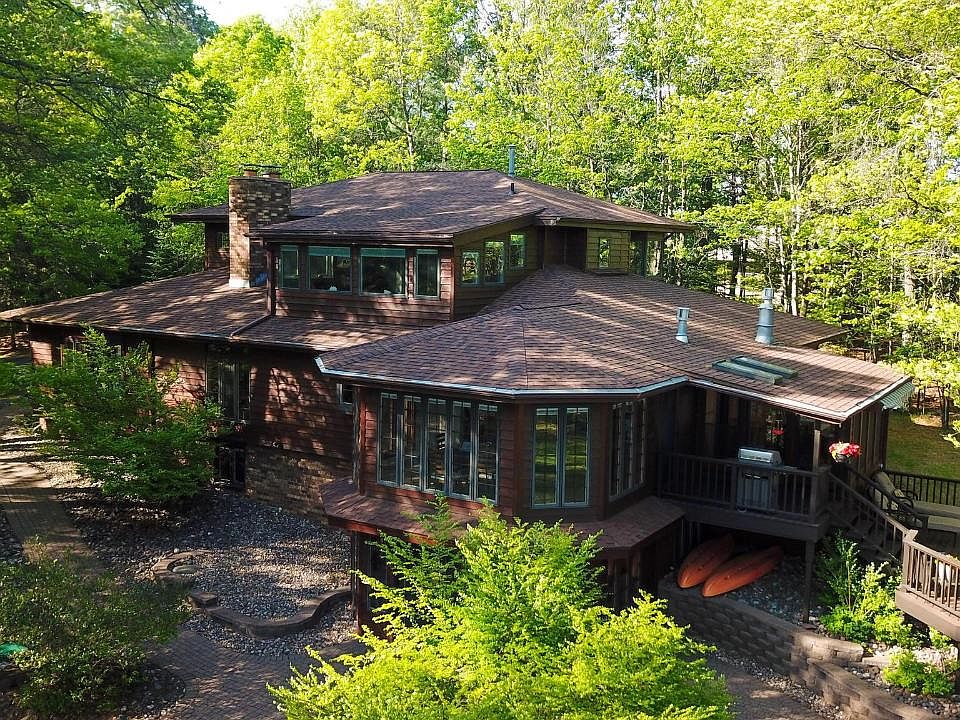High-end living on a park-like parcel w/ 361 feet of frontage on the Rhinelander Chain is what you will find at this impressive 5+ bedroom, 5 bath home on no-thru Mohawk Road. The home’s main level features a living room & den w/ double-sided fireplace, a full bath, 3 bedrooms, including a primary suite w/ full bath, and a gourmet kitchen w/ quality cabinetry, upscale appliances, granite countertops & gas fireplace, plus the adjoining formal dining room w/ south-facing lake views. The upper level offers 2 more bedrooms, a full bath, another bedroom suite w/ full bath, and an office w/ panoramic water views. The lower level provides a guest room, exercise area, workshop space, a full bath w/ sauna, the family room w/ wet bar & fireplace, and a rec room w/ walkout. The 1.51-acre lot enjoys attractive landscaping, a brick paver firepit, an enclosed porch, expansive deck, and a gradual approach to the sandy shoreline. Truly a substantial and extraordinary home! (SEE VIDEO TOUR!!)