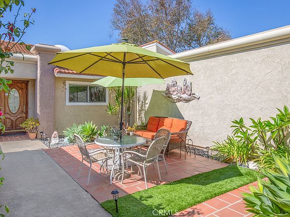 Gorgeous remodeled & expanded 3-bedroom, 2-bath single-level “Cabrillo” residence with a lovely panoramic golf course view. Located in the Laguna Woods senior community on a cul-de-sac far from busy roads & noisy highways, this home has excellent curb appeal. Beyond the wrought-iron front gate is a beautiful tiled courtyard w/immaculate landscaping highlighted by rose bushes. This idyllic outdoor space is perfectly suited for dining, entertaining or quiet relaxation. Custom front door w/stylish glass inserts welcomes guests into a home boasting high-end materials & tasteful finishes throughout. Enormous living room easily accommodates large furnishings in a variety of configurations. Gorgeous kitchen features custom maple cabinetry w/ample storage capacity & convenient features such as pull-out shelves & soft-close cabinet drawers. Attractive backsplash is highlighted w/elegant glass crystal accents. Additional kitchen features include granite countertops, stainless steel appliances, lazy susan, breakfast bar that seats two & window overlooking the front courtyard. Primary bedroom suite includes generous closet space w/mirrored sliding doors. Primary bathroom has custom wood cabinetry, marble countertops, dual sinks & an oversized shower w/grab bars. One guest bedroom has been expanded to create a multi-purpose area (w/separate entrance from the front courtyard) that could easily serve as an exercise studio, arts & crafts workshop or home office. Additional features include central HVAC, recessed lighting, ceiling fans in all bedrooms & living room, dual-pane windows & sliders, skylights in the kitchen, living room & both bathrooms, crown molding & baseboards, lots of closet storage throughout & a Ring security system. This home is environmentally friendly w/non-toxic products used throughout including hypoallergenic floating cork panel flooring & Safecoat non-toxic paint. Large covered rear patio boasts a stunning panoramic golf course/greenbelt view & is accessible from both the living room & the primary bedroom. Enjoy year-round outdoor entertaining & dining with a magnificent view! This home’s layout is ideal for a homeowner who enjoys both large & small-scale indoor or outdoor entertaining. Detached oversized 2-car garage has epoxy flooring & stores the washer/dryer, utility sink & many built-in storage cabinets. Driveway easily accommodates parking for 2 additional vehicles. Do not miss this beautiful luxury property!
