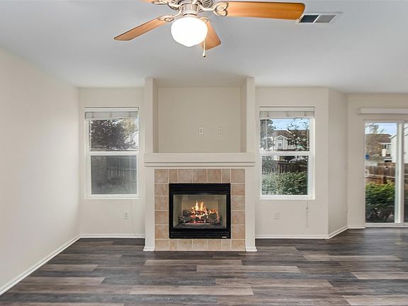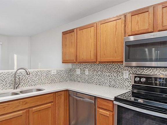 This Aurora townhome offers quartz kitchen countertops, quartz master bath countertops, a fireplace, stainless steel appliances, a patio, and a two-car garage.