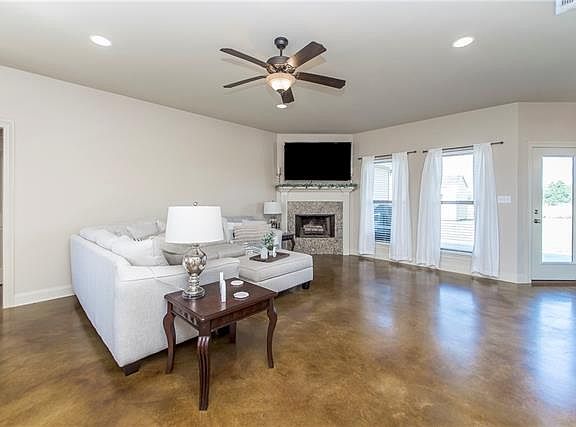 JUST WOW!! This 3/2 Loranger BEAUTY offers an open floor plan with high ceilings, stained concrete floors throughout, granite countertops, A wood burning fireplace, custom oak cabinets, stainless appliances, covered parking and more. Master suite boasts with separate tub/shower, his/her sinks, and a large walk in closet. The covered patio is great for entertaining. It's sure to impress. Schedule your showing today!!