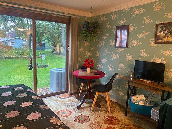 The Kinkade Cottage Tree and Garden Room is a lovely Master Suite with a sliding glass patio door with view of the back yard trees and garden. This suite has a newly remodeled bathroom, and is fully furnished with a portable washing machine, dorm style refrigerator, microwave oven, TV, dining table, desk, queen bed, and a cot for guests. The space is also pet friendly for cats or small dogs. The back yard is not fully fenced, but dogs are welcome. You will also have access to a three season porch and back poatio area with a barbeque. No smoking inside. Owner pays all utilituies (internet, electricity, garbage, sewer, water, lawn maintenance, snow removal). One month miunimum. First and last moi nth's rent required to move in. 30 days notice for each party to vacate.