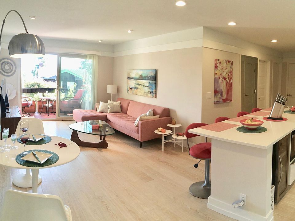 FURNISHED GORGEOUS FULLY RENOVATED CONDO AVAIL AUGUST. FLEXIBLE LEASE DURATION. This peaceful and lovely apartment is set amongst the trees, hills and charming homes of the Grand Lake neighborhood. So quiet, yet it is super convenient to all the urban pleasures and conveniences. The building is vintage, but the apartment is 100% renovated using high quality, stylish finishes and fixtures from floor to ceiling, including new appliances, floors, doors and windows. 2 minute drive / 5 minute bike ride / 5-10 minute walk to: @ Lake Merritt @ Farmers Market @ Grand Lake Theater @ Rose Garden @ Casual Carpool and Express SF bus @ Trader Joe's, Whole Foods and Safeway @ LakeShore Drive shopping and dining @ Culinary destinations on Grand Ave such as Camino, Penrose, Star, Boot and Shoe Service and lots of family eateries from every culture. 5 minute drive / 10 minute bike ride or $4.75 carpool service to: @ 19th Street BART Station @ Kaiser Permanente HQ @ Fox Theater @ Paramount Theater @ More cool restaurants, cafes and clubs The south facing balcony is sunny with an open vista and provides a great spot to relax and watch your herb garden grow as you contemplate your plans for fun on the town. The open floor plan has great feng shui so you and your energy can flow unhindered as you cook, entertain or just chill out. Whitewashed hardwood floors and Berber carpet feel good under your feet as you stroll about. Sleek white cabinetry, quartz counters and stainless steel appliances are accented by Italian glass tile to create a modern, clean, uplifting environment. Furnished option includes: Mid century modern decor with replicas of the Saarinen tulip dining set, Noguchi coffee table and Eileen Gray side table, anchored by a Room & Board sofa, Crate & Barrel walnut console and bold splashes of art. Office has a desk and murphy bed. Master has a clean white bed, chest of drawers and sitting area by the big window. The bi-weekly housekeeper helps keep things sparkling and is included in the rent. Attached garage has one space next to the building entrance for easy access. The neighbors are friendly and helpful, without being intrusive or bothersome. Let me know if you are interested and what your desired lease duration is. Note: Only orderly, thoughtful people with good credit please. FLEXIBLE LEASE. Rental rate based on term: 24 mos: $3295/mo 12 mos: $3395/mo 7-11 mos: $3495 3-6 mos: $3695