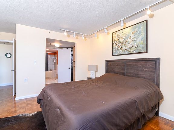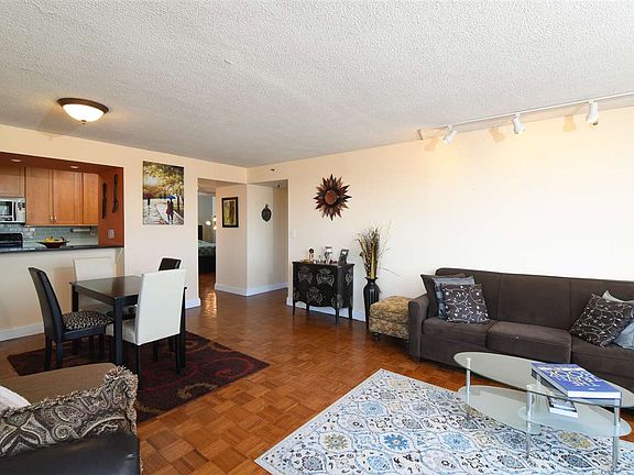 Bright and spacious condo with direct Manhattan views awaits you at The Skyline - the most conveniently located full amenity building in Hoboken. Updated kitchen with stainless steel appliances, granite counters, glass tile backsplash and breakfast bar that opens to the living and dining rooms with unobstructed views of the NYC skyline. The master suite offers two double closets and an attached bath. Amenities include 24-hour valet parking, updated on-site gym, weekday concierge and private shuttle to the PATH. Located a few blocks from restaurants, shops, cafes and transportation.