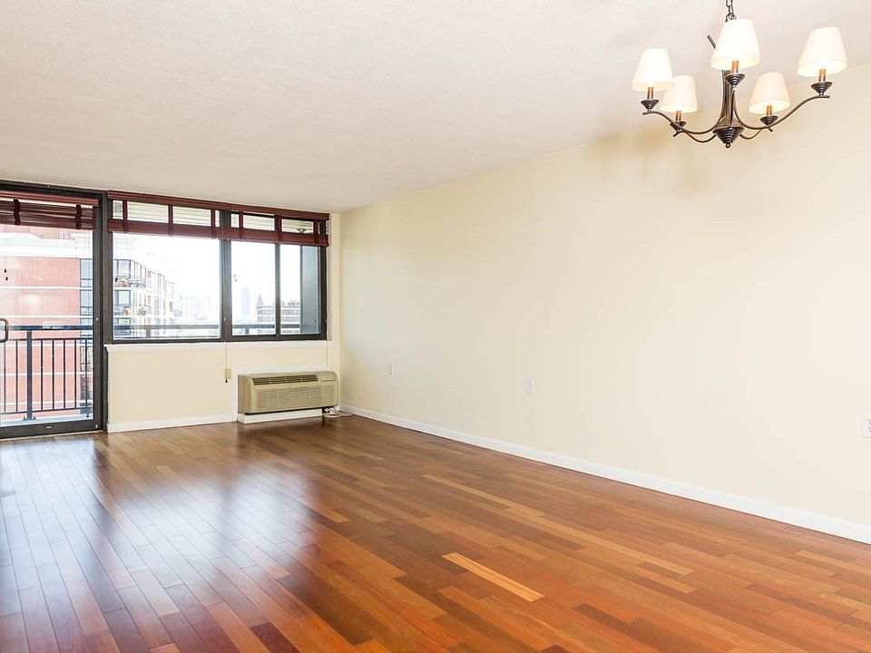This modern 800+ square foot 1 bedroom/1 bath features new hardwood floors throughout. The renovated full open kitchen comes equipped with custom cabinets, granite countertops, and halogen track lighting. Deep Whirlpool tub in bath. Enjoy water and Downtown NYC views from your private 20 foot wide balcony. 1 indoor parking space is included. The Skyline features a gym, shuttle to PATH, 24-hour valet, and a weekday lobby concierge for packages.