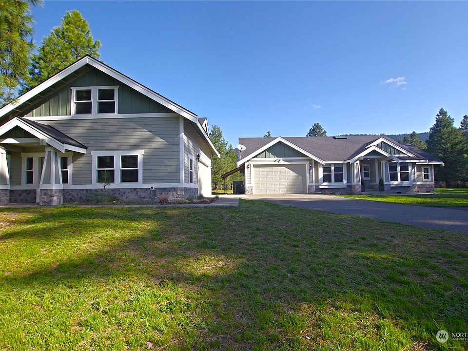 Price improvement on this beautiful ramble on 3 acres. Home has 3 bedrooms, 2 full baths w open concept. View thru FP adds a very nice ambiance on a chilly evening or morning. Home has a 5ft fire wise stamped concrete walkway surrounding the home, 2+car drive thru attached garage, paved driveway & a newer 2+car garage w drive thru w 684 sq footage (included in total) living space w 3/4 bath, kitchen easily added upstairs & bedroom. Home has a fenced dog run & the comm. is 4 rail fenced by developer. Added features include Culligan H2O syst w softener, new heat pump, paint outside, hard wood floors, SS fridge & microwave, granite counts & 2 prop. torches & flagpole added last year. Pls see 3D Tour. 5/14 driveway just sealed