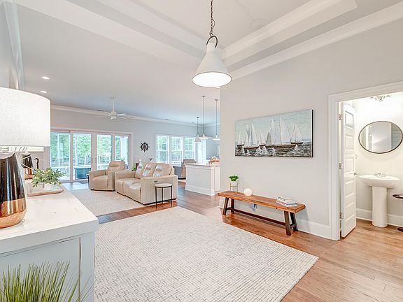 Nestled in the stunning gated community of The Bridges at Seven Lakes, this exquisite lakefront home offers a sanctuary of peace and serenity. From the moment you arrive, the meticulously landscaped front yard and charming exterior welcome you with open arms. Stepping through the elegant double front doors, you are immediately enveloped by a sense of warmth and sophistication. The open floor plan, awash with natural light, showcases gorgeous engineered hardwood flooring, 11 ft ceilings, and custom moulding.The grand foyer features a tray ceiling and seamlessly flows into a cozy family room, where a fireplace and custom built-ins create an inviting atmosphere. Here, panoramic lake views serve as a breathtaking backdrop.The adjacent kitchen is a culinary dream, featuring pristine white cabinetry (including custom roll out drawers), luxurious stone countertops, stainless steel appliances, and a large pantry. An island with seating, a stylish subway tile backsplash, and a built-in coffee station enhance both functionality and style. The casual dining area, framed by more stunning views, is perfect for everyday meals, while the formal dining area, complete with built-in cabinets and countertop space, is ideal for entertaining guests. Retreat to the primary bedroom, a true haven with its tray ceiling and captivating lake vistas. The en suite bath, accessible through double doors, boasts a dual sink vanity, a spacious tile step-in shower, and a generous walk-in closet. Two additional bedrooms, a well-appointed full bathroom with dual sinks, a powder room, and a convenient laundry room with ample built-in storage complete the interior of this magnificent home. For added convenience, structured wiring with CAT 5 cables runs to all the bedrooms, the living room, and the butler's pantry. Even the oversized garage is thoughtfully designed, offering plenty of storage with built-in cabinets and a utility sink. Outdoors, the covered porch and patio provide the perfect setting to relish the fenced backyard and unobstructed lake views. Raised garden beds in the backyard offer a great spot to plant vegetables and plants. There is also a custom 8 x 12 workshop with electric on a concrete pad; perfect for those that love a project. Lawn irrigation is in place to keep the grass watered, and there is drip irrigation in the landscaped areas as well. Living in the 353 acre, 150 home, Bridges at Seven Lakes community means indulging in top-tier community amenities, including a swimming pool, firepit area, play park, Bocci court, and a dock for lake access. This home is a rare gem, offering an unparalleled lifestyle in a coveted location. Don't let this slice of paradise slip away! *Seller is a licensed real estate agent
