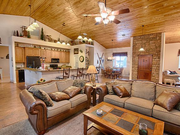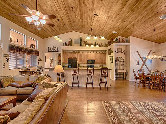 Location, Location, Location! SELLER JUST REDUCED 50K! Shows pride of ownership inside & out! Enjoy the peace & tranquilly this beautiful cabin in the whispering pines has to offer!Interior offers open split floor plan, the two guest rooms have their own bath, all one level, large great room & den/office area, wood burning FP, an abundanceof cabinets & counter space in kitchen, easy care laminate flooring, vaulted ceilings with T& G in great room/kitchen & den/office area, spacious master suiteContinued..
