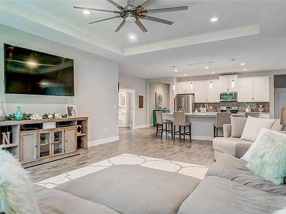 - Interior Features: Ceiling Fans(s), Eating Space In Kitchen, High Ceiling(s), Master Bedroom Downstairs, Open Floorplan, Split Bedroom, Walk-In Closet(s), Thermostat, Kitchen/Family Room Combo, Solid Surface Counters, Window Treatments, Tray Ceiling(s)