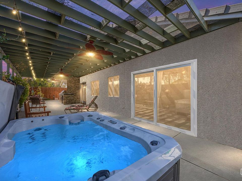 Riverlakes 4B/2B home with 2172 sqft on a cul-de-sac lot. You'll start enjoying this home before you even step inside with its charming front porch and Monji designed front yard setting the tone for what's to come. Out back, a backyard escape awaits featuring an above ground spa, pergola with sun screens & misters, an outdoor kitchen complete with refrigerator topping it off with nearly all block walls for added privacy. This home comes with PAID solar, a valuable perk that means immediate savings on energy bills from day one and fantastic benefit for a new homeowner. Enjoy the flexibility of two living areas, perfect for relaxing or entertaining, paired with a kitchen featuring sleek granite counters. Enjoy the beauty and easy maintenance of laminate wood-look flooring throughout the home. Outside, take advantage of RV parking complete with hookups and a custom iron gate for added convenience and security. All of this while enjoying all of the perks of Riverlakes community!