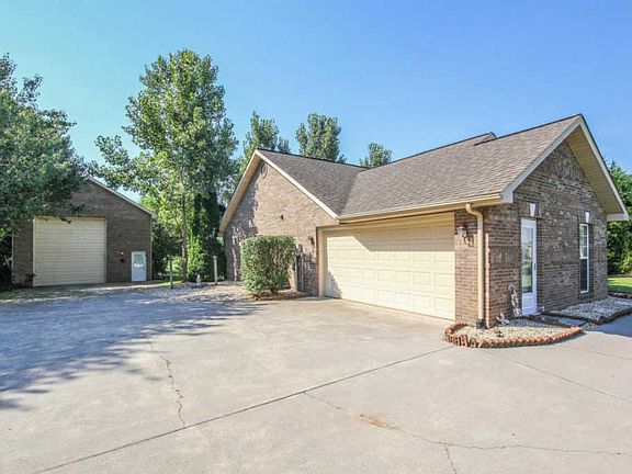 This custom built brick home sits on a large level lot and offers low maintenance living. House is a split bedroom plan with eat-in kitchen and back patio. There is a HUGE RV garage that could also be used for any large vehicle or boat. The detached RV garage is heated and cooled and also features 2 office/work areas plus upstairs storage. The garage is reason itself to view this house! Owners have moved and must sell. This one is move-in ready.