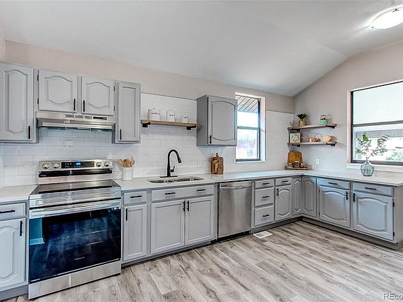 Welcome to this tastefully remodeled ranch located in Commerce City, Colorado. This delightful home boasts three bedrooms and two bathrooms, both adorned with custom tile, creating a sophisticated and modern aesthetic. The kitchen features new stainless-steel appliances and quartz countertops that perfectly complement the sleek design. Step into the spacious living room, kitchen, and main bath to discover the beautiful new vinyl plank flooring, providing durability and elegance. The bedrooms are adorned with plush new carpeting, ensuring comfort and coziness. With fresh interior and exterior paint, the home exudes a fresh and inviting atmosphere. Outside, a private fenced backyard offers a serene retreat, while the large oversized detached garage with alley access provides ample space for parking and storage. Nestled on a quiet street, this residence is conveniently located near schools, parks, the North Field Shopping Center, and offers easy access to Interstates 270 and 70. Don't miss the opportunity to make this your new home sweet home!