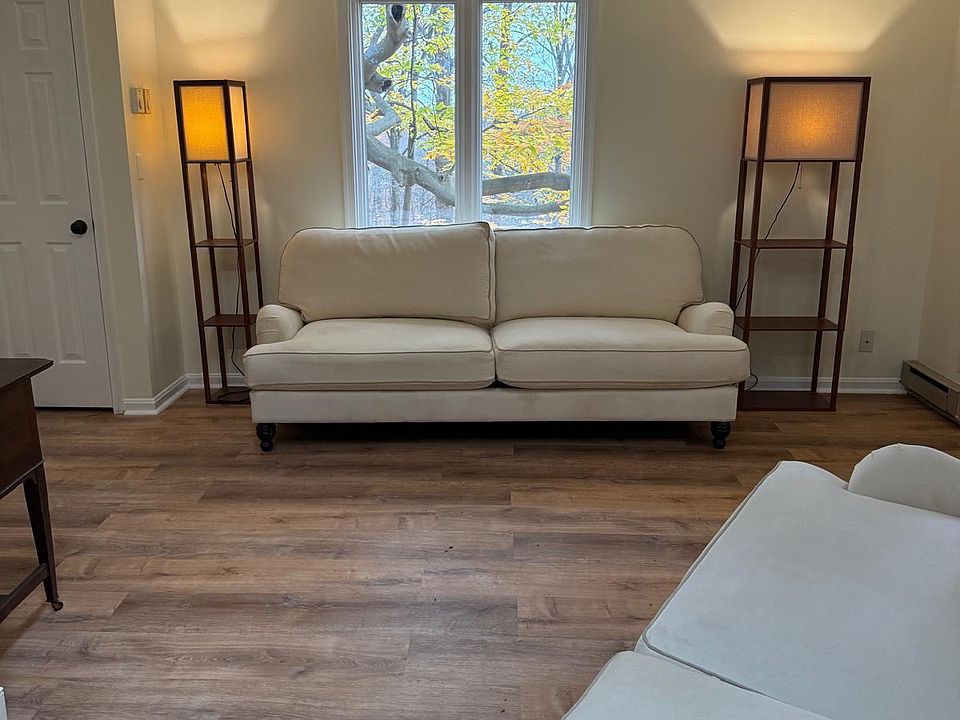 Furnished (1) bedroom apartment above garage, separate private entrance with raised balcony entrance, full kitchen and bath, living room, small office and laundry room. Electric and cable are separate