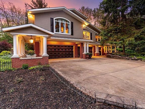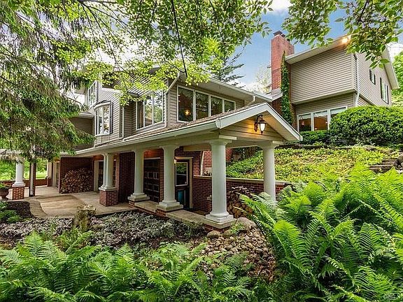 Beautiful house w/impressive character, attention to detail & lots of nature views. 2 acres with wonderful hardscape features. Gardens planted with perennials blooming throughout the season. Could be a great multigenerational home, with 2 separate, dramatic private entrances. 4 bedroom suites, 2 per level, each with bathroom, large closets & separate living area. Features a fully equipped kitchen, walk in pantries, laundry room & guest bathroom. Garden room dining, with window walls overlooking the property, & formal dining room with fireplace. Loads of windows & skylights. Antique stained glass windows. Formal living room, family room, north-light activity studio, huge office & 4th level loft. Drive-in basement activity studio, plus 5 bay garage. So many possibilities. New roof being installed! New steel chimney flues being installed.