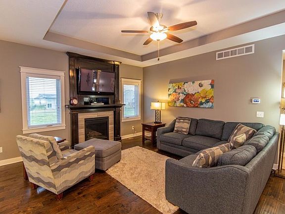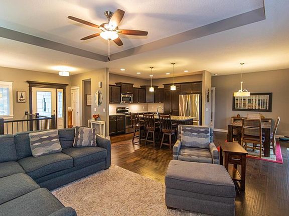 Welcome Home! Better than new 5 bedroom, 3 bathroom ranch with an open floor plan and over 2,600 finished sq. feet. The main level features the spacious living room with a gas fireplace, the kitchen with stainless steel appliances, a hidden pantry, and a large island, dining area, master bedroom with walk-in closet and en-suite bathroom that includes dual sinks, a jetted tub, and a tile shower, two additional bedrooms, a full bathroom, and main-level laundry. Now head on downstairs to check out the finished walkout basement that is perfect for entertaining. The basement features 9ft ceilings, a large living room, and play area, a wet bar, a sliding barn door leading to the perfect storage area for toys and games, two bedrooms, a 3/4 bathroom, tons of storage including built-in storage in the storage room. There's more to enjoy about this home including the 3-car attached garage, lawn irrigation, and the outdoor space that is perfect for family gatherings.