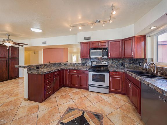 Major updates to this 3 Bedroom, 2 Bath Home with 590 sf - 2 car Garage (appraiser) with extra storage. Updated Kitchen and Baths, Updated Insulated Windows, Jacuzzi tub in hall bath. Stainless appliances, Ceramic Tile Flooring throughout, Fireplace, Ceiling fans, Tile counters, Covered patios. Beautiful masonry walled Entry Courtyard with Security gate. North facing rear yard with Mountain Views and masonry wall. Xeriscape landscaping with passive water conservation and drip irrigation systems. New updated electrical service throughout the house.
