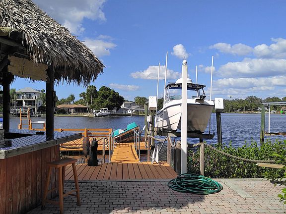 Located in Sunset Point with NO HOA fees. We'll here it is. Nice surprises around every corner of this 2 bedroom, 2 bath home 2304 square foot home. Built in 2002, central heat and air for year round comforts. There is a separate two-car garage. Den could be 3rd bedroom or formal living area. Crown molding, chair railing, and upgraded features surround the formal dining room. Builtin butler's pantry which passes through to kitchen area from Dining Rm. Large open kitchen with breakfast area and side bay window bringing in all the light. Hardwood flooring throughout the family room and other areas of the home. High ceilings, skylights, French doors, breakfast bar, Corian countertops, 42" Cabinets with dental molding. Lead glass front door with skylights. Master bath has jetted spa area in shower. Tons of storage space. Pass through elevator. Heated diamond bright treated pool, pool house, floating dock Electric boat davit, decorated fencing. Both floating & stationary docks erected on property. Tons of storage and play areas for the largest of entertaining. Pavers in walkways and under decking areas. This house has too many amenities to mention. It's everything you want and more. Magnificent sunrises and sunsets, reflecting off the serene waters. A Double lot property.