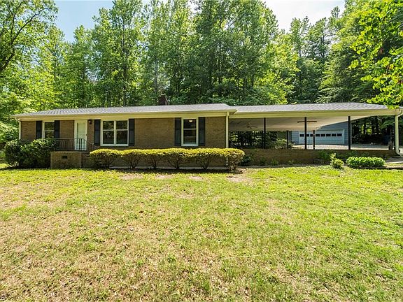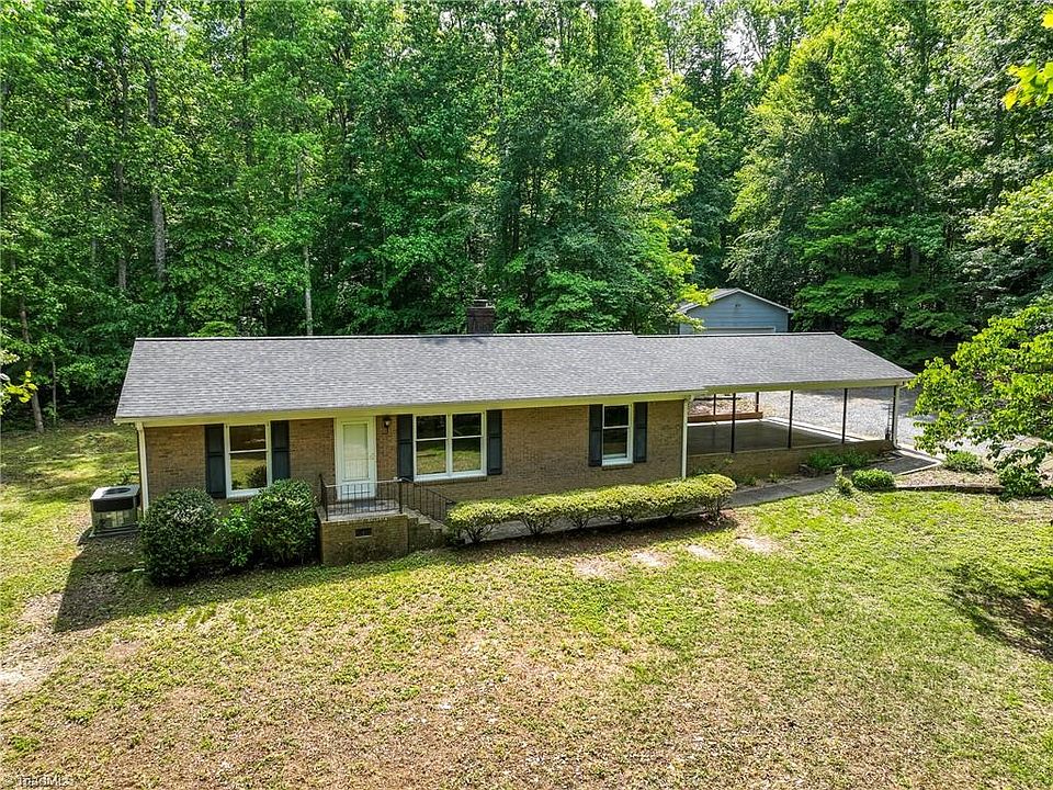 SECLUDED, QUIET HOMESTEAD! Imagine this 3 bedroom, 2 bath Home on 3.73 ACRES boasting oversized carport, 2 car garage, storage building/work studio, large detached shelter & chicken coop! 2.5 yr old roof & heat pump/HVAC. Water softener & reverse osmosis system. All brick home sits over 200' from Rd on large wooded parcel. Winding circle drive with very ample parking area. Beautiful engineered hardwood flooring. Family room boasts gorgeous curved brick surround wood burning fireplace and wood mantle. Kitchen has great counterspace and stainless double sink, stainless exhaust hood & dishwasher. Dining overlooks awesome sunroom with 5 sets of double sliding doors with screens. Primary suite on front of home with walk-in closet and in-suite bath. 2 additional spacious bedrooms on left of home, full bath and laundry room. Carport would be great for entertaining/celebrations. Storage building has flooring, built-in desk and is wired. Crawl space in fully insulated and encapsulated.