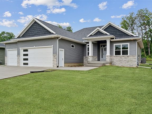 Welcome to Ushers Ridge, a peaceful dead-end, tree-lined street in one of Cedar Rapids' most coveted neighborhoods. This home sits on a large flat lot that offers privacy with trees and privacy to the rear. A fully sodded yard will be completed before closing. Rear covered composite deck. Built by BStickley Homes quality construction is nearly 3,200 sq. ft. of finished space. The main floor has 10-12 ft. ceilings with scenic timber views. The kitchen features a massive island, complemented by top-tier appliances, to be installed before closing. The oversized master bedroom includes an en-suite. The finished lower level adds 2 extra bedrooms, plus a third room perfect for an exercise space, office, or potential theater. The rec-room has a wet bar, game area, and a stone fireplace. The builder spared no expense on this home, using top-of-the-line products throughout! Basement square footage is estimated; buyer to verify.