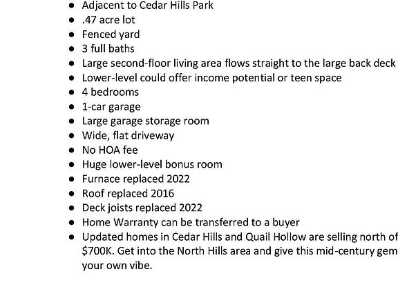**GORGEOUS NEW FLOORING** Your mid-century dreams have come true. Located in highly desirable Cedar Hill Estates and 1.5 miles from the shopping, restaurants, and entertainment of North Hills, this spacious 4 bedroom/3 full bath home is ready for your flair! The vibe starts in the split foyer lined with ceiling-to-floor asymmetrical windows. Light floods into the main living space through huge sliding doors on both sides of the family room while the deck overlooks the HUGE fenced back yard. Lower level has a garage entrance, full bath, and 'bonus' room giving you income potential, secluded office, or teen space. Tons of storage in the lower-level space off of the garage. Like disc golf? Cedar Hills Park is RIGHT NEXT DOOR! Refurbished homes in the neighborhood selling from $700K+, so get in NOW!
