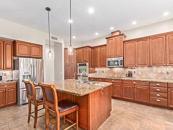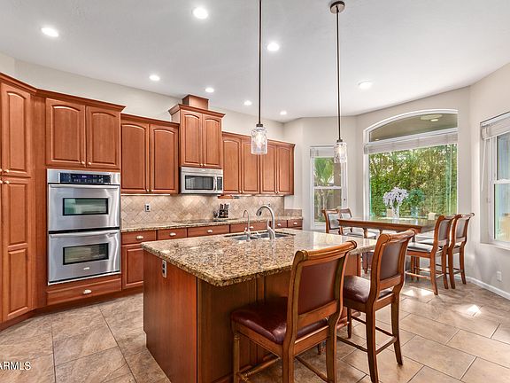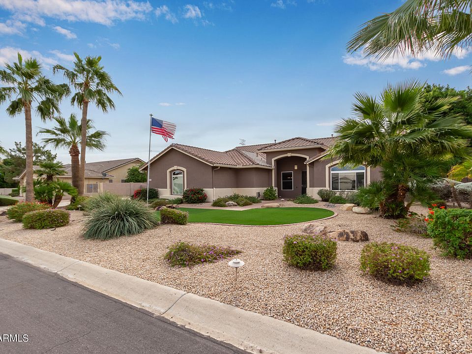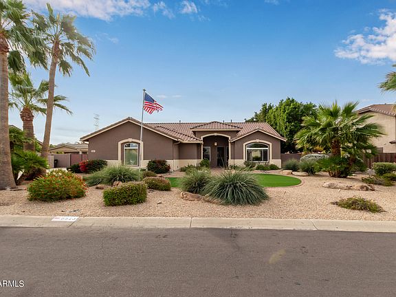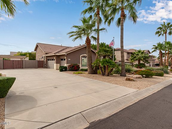 AMAZING LOCATION w/an OVERSIZED LOT & NO HOA! Stunning 4 Bedroom, 2.5 Bath, Single Story Home w/Mountain Views & Pool*Lush front yard w/an oversized 3-car side-entry garage w/epoxy flooring, built in cabs, & an RV gate w/an extended driveway*Beautiful gourmet kitchen, w/ double ovens, granite counters, built in micro, travertine tile backsplash, recessed & pendant lighting, custom cabs, center island w/breakfast bar & stainless steel appliances. The home has a fabulous split floor plan, high ceilings, tile flooring, soft carpet & abundant natural light throughout. Resort style backyard featuring a pool w/waterfall, covered patio, pergola & built-in BBQ w/bar. NEW ITEMS Roof(2018) AC unit(2022) Garage Doors/Openers (2020) H2O heater(2022) Master Shower Surround(2022). Don't miss it! An island w/a breakfast bar & a bright breakfast nook w/a bay window are perfect for morning conversations or casual dining. The grand main suite is a sanctuary of relaxation highlighting a double-door entry, a full bathroom w/dual sinks, & a walk-in closet. The home's elegance extends outdoors to the enchanting backyard. A covered patio, a verdant landscape, a hot tub, a built-in BBQ under a ramada, & a crystal blue pool ready to enjoy. Hurry! Your paradise awaits!