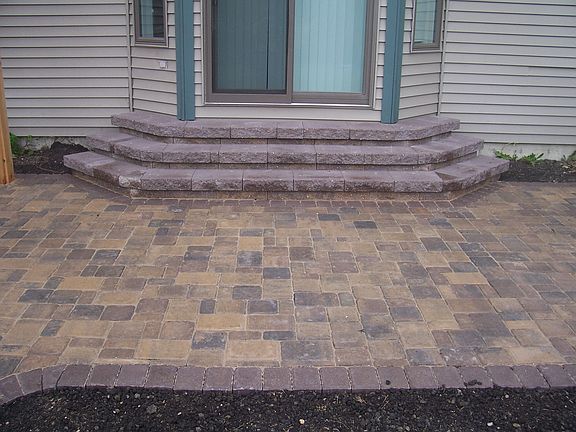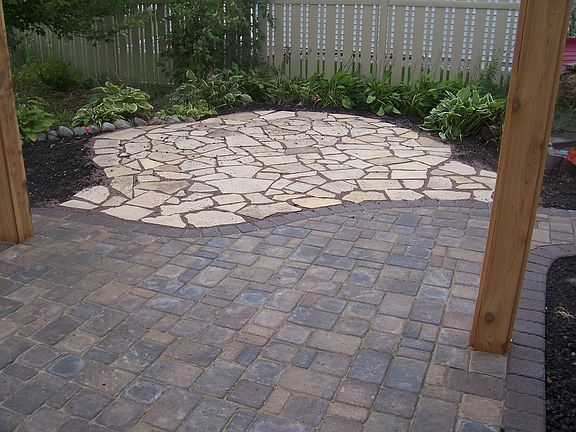 Paver patio and fire pit area in the backyard along with mature landscaping and a maintenance free fence