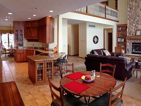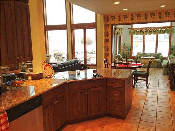 Great water lot & super views from most rooms. Custom kitchen w/granite overlooks 2 story great room w/stone fireplace. 1st floor MBR w/see through fireplace into sunroom. Additional sunroom off kit.. Deluxe 1st floor den w/built ins. 4 BRs up & large loft w/built in desks & bookcases. Additional 1700 sq.ft.in finished lower level. Deck w/large hot tub. Lake w/islands for swimming & fishing.