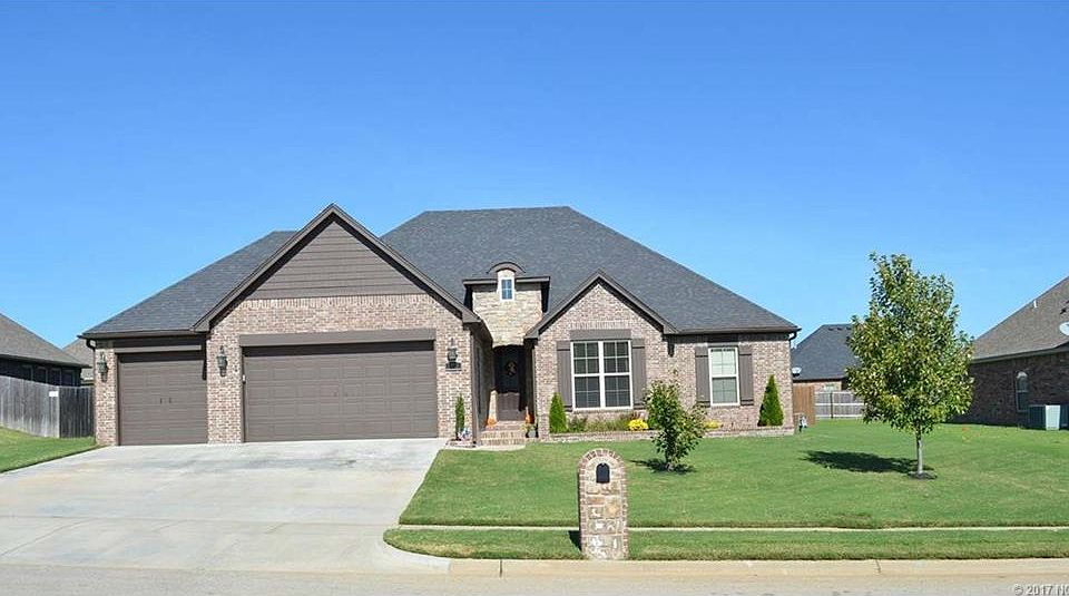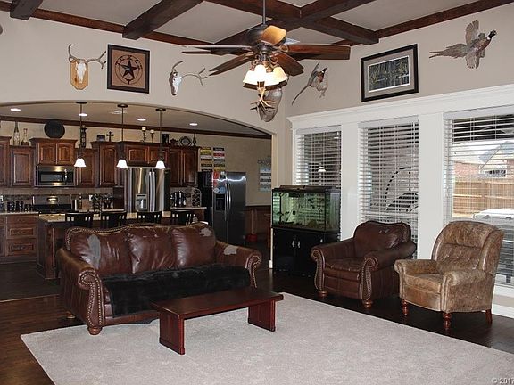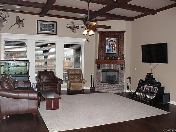Custom built open floor plan with many unique features. Beautiful wood beamed ceiling, wood flooring & trim. Arch wall accents, raised ceilings & crown molding. Master has extra space for reading nook plus large walk in closet and luxury bath. Office with closet is large enough to be a 4th bedroom. Covered back patio has gas log fireplace and TV mount. Hot tub and TV negotiable. A must see!! Call or text listing agent Kari Halferty at **918-914-0235**.