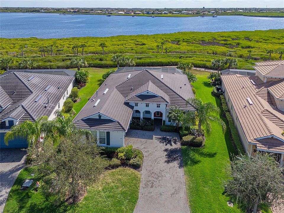 Exquisite maintenance-free home with Full River Views, located inside the gated resort and boating community known as Tidewater Preserve! Gorgeous wide-plank hardwoods throughout the majority of the home. Built in 2015 with many upgrades, this 3 bedroom, 2.5 bathroom home shows like a builder's model, includes DEN, 12 Feet high ceilings with custom design trims and crown molding in the trays, plantation shutters, high-end lighting, ceiling fans, and travertine flooring in the laundry room. The kitchen is a show stopper. The freshly remodeled kitchen was well thought out. It has the most sensational level 7 Quartz countertops, 42” Solid wood cabinetry, upgraded gas appliances, and bar stool space for entertaining. Outside, true Florida living comes into play with the gas heated pool and spa, complete outdoor kitchen, true pool bath(only accessible outside), outdoor shower, space and privacy, with full panoramic views of the river. Catch glimpses of the dolphins jumping.. With a truly oversized side-loading garage (size of a 3 car), and its interior design, this home has plenty of space for storage as well as living! TWP is a 24/7 guard gated, resort quality community with private marina, boat slips are rented annually, 2 covered boat locks provide access to the Manatee River/Gulf, 2 clubhouses, fully equipped with 2 fitness centers, beach entry pool)FULL RIVER VIEWS, 2 satellite pools, har-Tru tennis courts, dog park, playground, kayak and canoe launch, nature trails along the river with descriptions of the birds of Tidewater and Florida, and activities are coordinated by on-site Activity Director. Low HOA and no CDD. Perfectly located in the relaxed boating lifestyle community of Tidewater Preserve and convenient to Lakewood Ranch, Sarasota, and world-class beaches, this immaculate riverfront house is now available. Take note fences are allowed, they must be wrought iron. Bedroom Closet Type: Walk-in Closet (Primary Bedroom).