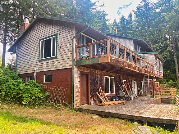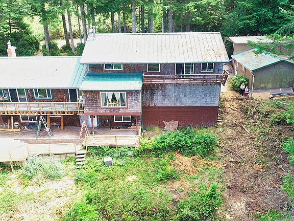 OPPORTUNITY KNOCKS! Value packed bargain has so much good but needs further renovation. Motivated Sellers now working elsewhere. The Good: 10 forested acres of beauty and peaceful solitude & boy does it smell nice out here in a fir forest! 3744 sq. ft., 5 bedroom, 3 bath, cedar shingled, 3 level home with NEWER metal roof, gutters with screens, windows, deck railings & Luxury Vinyl Plank Flooring. Also has a circular paved driveway, stone fireplace, wood beamed ceilings, a woodstove, a huge pantry, guest apartment (no real kitchen) with another bathroom, RV carport, 2 car attached garage, additional detached garage, metal wrapped fascia, wood shop, sauna, a small pond!! & a pinch of distant ocean view! Cash best.