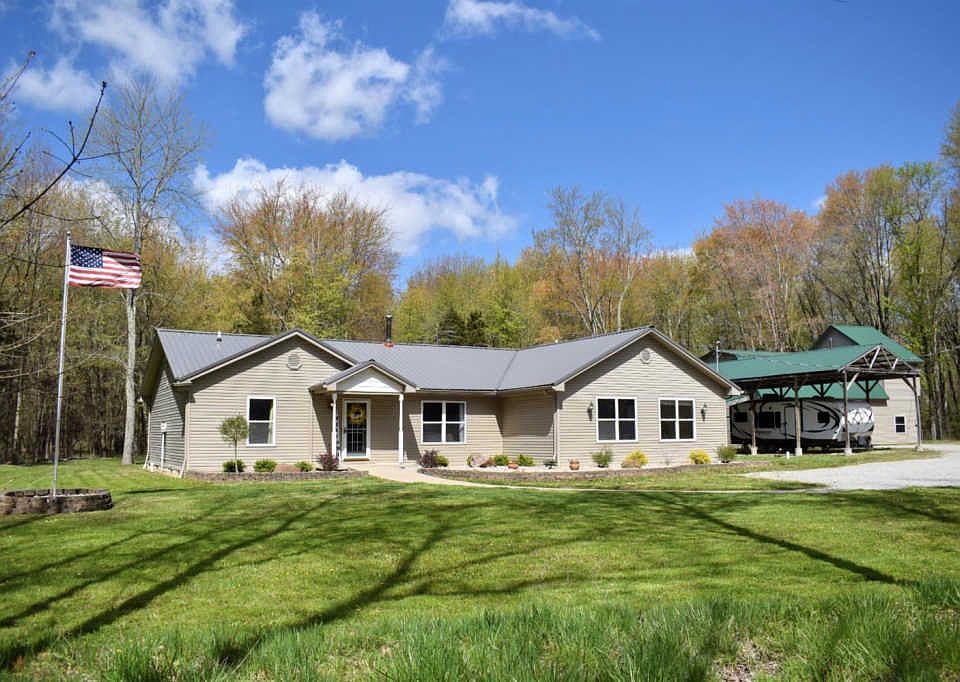 Secluded 28 acres. Possibilities abound! Your own mini farm/hunting compound with 3 ponds,large detached garage and camper/carport. Home features 3 bdrms, 3 full baths, study plus a LL exercise room/ storage room. Detached garage has loft guest house just needs finishing touches. Private and Quiet desired setting!