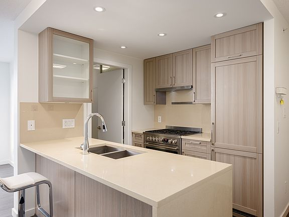 Welcome home to Wall Centre Central Park, situated in the sought-after Renfrew-Collingwood area. This bright, open-concept condo features engineered hardwood flooring, over-height ceilings, and floor-to-ceiling windows allowing tons of light to flow throughout. Step outside onto the spacious balcony to relax while overlooking unobstructed Northeast facing mountain views. The gourmet kitchen comes equipped with shaker style cabinetry, integrated high-end appliances, including a gas range, and luxurious polished quartz countertops. Residents have access to first-class amenities including a fully-equipped fitness facility, a 60ft indoor pool, hot tub, meeting rooms, outdoor lounge/park area, and community garden plots.