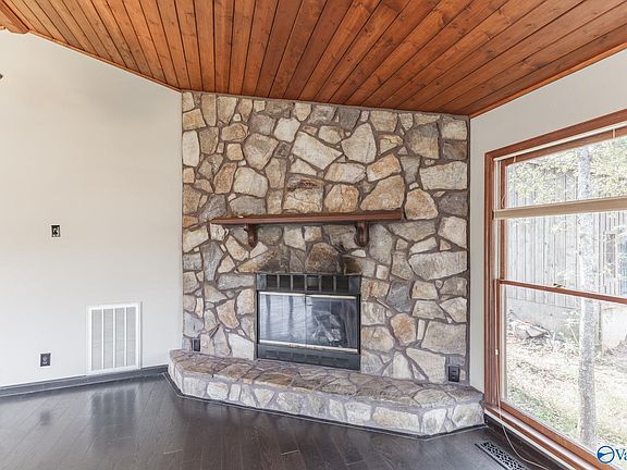 Cool cozy mountain retreat on Monte Sano Mtn! 3 BR, 3 BA, all bedrooms on first floor and all living space is upstairs. This flip flop plan works well on this lot with views across the street of the city lights of the valley. The upstairs has vaulted ceilings with tongue and groove wood ceilings and large windows surrounding all the living space. The kitchen is on the back of the house looking towards the backyard and has wood ceilings, granite countertops and wood cabinets. The exterior of this home has a covered patio on the front and a large back deck looking over the deep backyard.